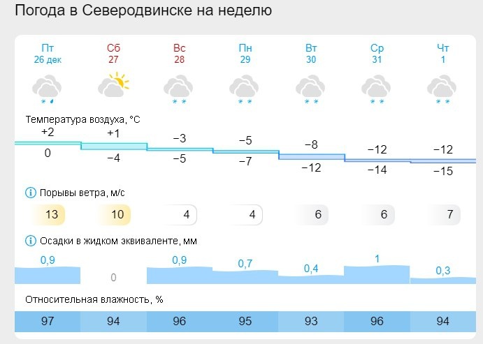 Снова прогнозируют осадки В Архангельской области снова установится морозная погода. Правда, минус пока несильный. Рассказываем, что ждет северян в последние выходные года. «В выходные дни 27–28 декабря Скандинавский циклон принесет в Поморье снежную, со слабыми морозами погоду. Ожидается ветер южных направлений. Температура воздуха в этот период составит -2, -7°, на юго-востоке области чуть холоднее -8, -13°», — рассказали в Северном УГМС. Также синоптики предупреждают: ночью и днем 27 декабря местами по Архангельской области ожидается гололед, налипание мокрого снега на проводах и деревьях. Подробнее: http://vk.com/chp_severodvinsk?w=wall-57296020_548361 ПРЕДЛОЖИТЬ СВОЮ НОВОСТЬ #Северодвинск
