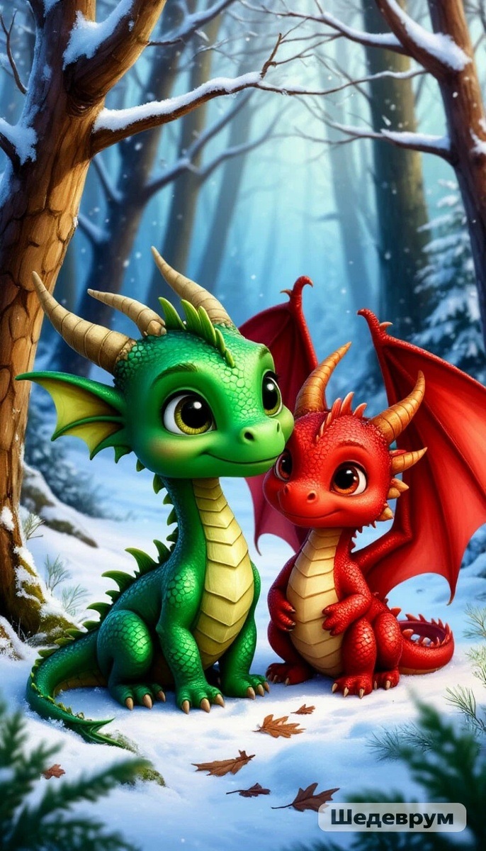 С тех пор в Снежном лесу поселились две искорки. Одна — была на самой красивой и большой ели. Другая — алая, яркая и смелая, девочка-дракончик.