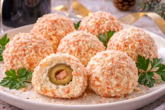 Для приготовления возьмите в равных пропорциях: твёрдый сыр, варёные яйца и крабовые палочки — по 150 г каждого. Также понадобится майонез 2–3 ст. л., 1 зубчик чеснока и банка оливок с креветкой или анчоусом (те самые, уже готовые — идеально подходят для начинки).