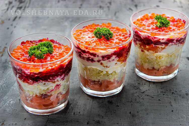 Изысканный королевский салат с лососем и красной икрой — одна из вариаций привычной всем нам селедки под «шубой». Подача праздничная, в стаканчиках. Салат слоеный. Основной ингредиент — красная рыба (лосось, семга и пр.). Набор овощей традиционный плюс вареное яйцо. Все продукты выкладываются слоями и промазываются майонезом. Украшается салат икрой. Такую «Царскую шубу» ваши гости наверняка оценят по достоинству! Примечание. Советуем заранее отварить картофель, морковь и свеклу — в кожуре, яйцо — вкрутую, полностью остудить, почистить. Рыбу для этого рецепта вы можете взять готовую слабосоленую или засолить ее самостоятельно (на сайте есть рецепт, как приготовить лосося в рассоле). Количество ингредиентов в рецепте указано на 3 стакана объемом 235 мл каждый. Общее время: 2 часа | Время приготовления: 20 минут