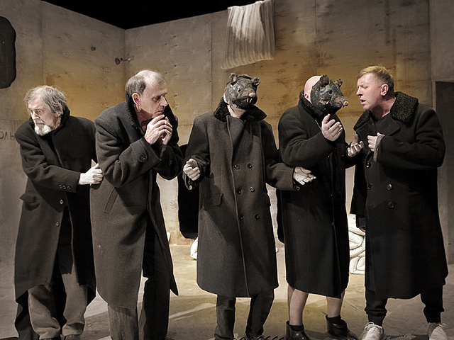 Итак, дело происходит в сумасшедшем доме (прям тянет всех в это заведение))): матрасы, фанерные стены и одинокий цветок - алоэ. На стене, как образ в красном углу, висит матрас. Одежда у всех соответствуюшая: свободные рубашки, подштаники и какое-то исподнее. У всех дёрганные движения, взъерошенные волосы: видно, что люди явно не в себе. Вся компашка - Городничий, Добчинский, Бобчинский, Земляника, Гибнер - ходит паровозиком друг за другом, в черных пальто и галошах на босу ногу. Настолько они противные, что вылезают из каких-то нор. Но прямо говорят, что они - крысы, только про Добчинского и Добчинского - у них на лицах маски.
