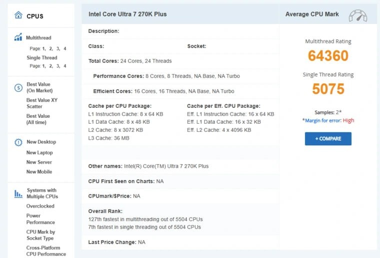 В базе PassMark появились результаты нового процессора Intel Core Ultra 7 270K Plus для сокета LGA 1851. Чип получил заметное обновление конфигурации: теперь он оснащён 8 P‑cores и 16 E‑cores (вместо 8P + 12E у 265K). 📌 Результаты тестов Однопоточная производительность • 5075 баллов • +3% к Core Ultra 7 265K (4925) • +13,5% к Core i7‑14700K (4463) • +15% к Ryzen 9800X3D (4426) Многопоточная производительность • 64 360 баллов • +9,5% к Core Ultra 7 265K (58 731) • +23,5% к Core i7‑14700K (52 184) • +61% к Ryzen 9800X3D (39 971) • Рост производительности объясняется увеличением числа E‑cores • 270K Plus почти догоняет старший Ultra 9 285K • Как всегда, синтетика ≠ реальная производительность в рабочих задачах и играх Если Intel продолжит так наращивать ядра в среднем сегменте, сможет ли AMD удержать преимущество X3D‑линеек в играх? 🤷♂️ 🖥 Заказать сборку ПК в InterPC 🔒 Закрытый чат 🌐 Наши каналы 🗺 #Intеl