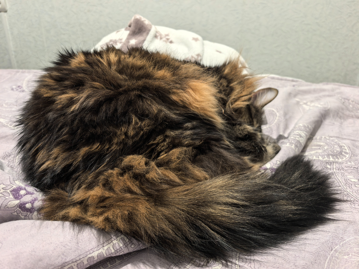 Пришла хозяйка, залезла под одеяло. И я к ней пришёл, лёг спать в виде шапки меховой:
