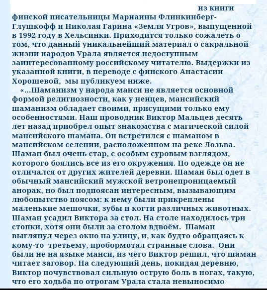 Он однажды тоже "попил водки" с одним мансийским шаманом. А на следующий день у него едва ноги не отнялись. А когда он через несколько лет снова оказался в этом мансийском поселке, местные мансюки этому очень удивились: "А мы думали, ты уже умер! Наш шаман сказал, что ты больше сюда никогда не вернешься - он на тебя какое-то очень сильное заклятие послал!"