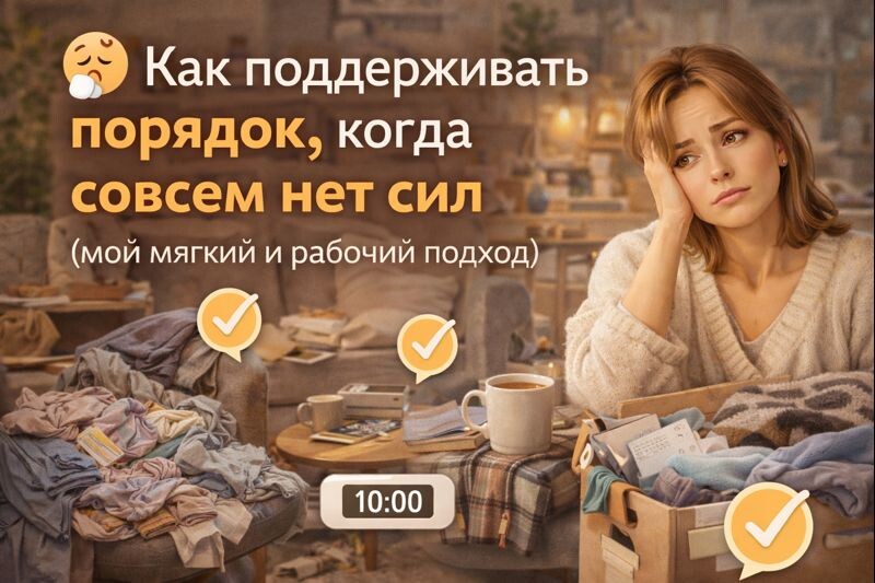 Без героизма и «ещё чуть-чуть». Очень часто: У меня есть одно место, куда я временно кладу всё, что не успела разобрать. Важно: Когда появляется энергия — разбираю. Когда нет — не ругаю себя. Я перестала относиться к дому как к экзамену. Теперь: И в таком состоянии убирать становится легче. Иногда лучший порядок — это: А дом подождёт. Он никуда не денется 🤍 💬 А как вы справляетесь, когда нет сил, а вокруг беспорядок?
