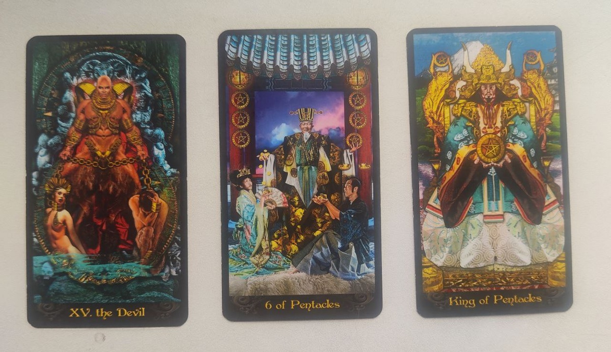 Сегодня у нас в раскладе Таро Иллюминатов три мощных аркана: Дьявол, Шестёрка Пентаклей, Король Пентаклей