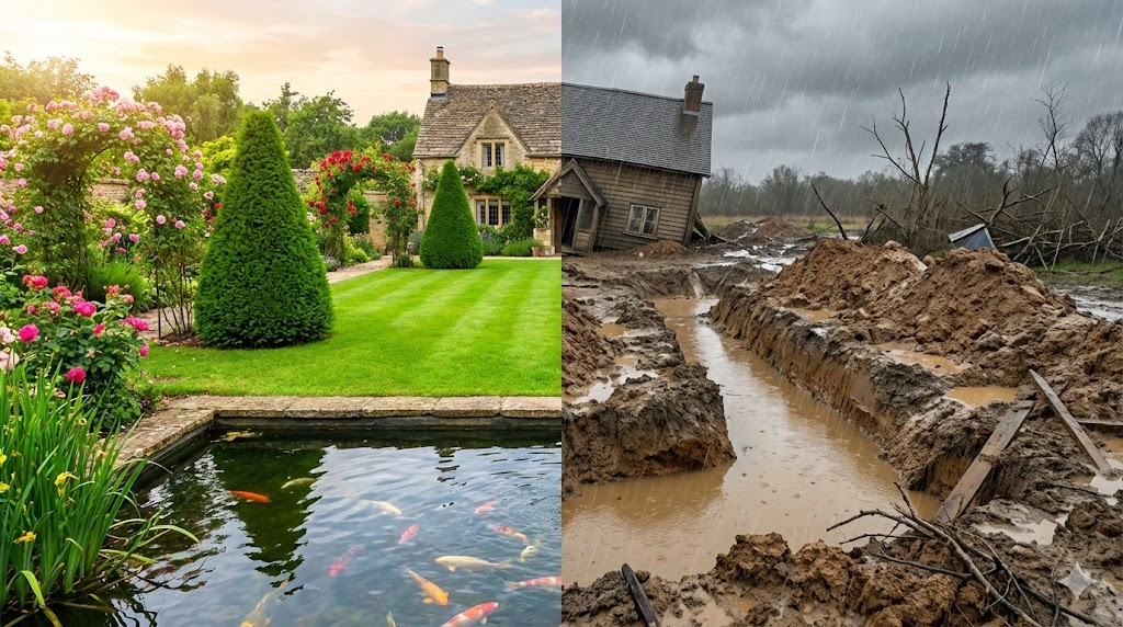 Поскольку здесь была низина и высокие грунтовые воды, я спроектировала и внедрила сложнейшую инженерную систему. Километр перфорированных труб в геотекстиле, уложенных на подушку из гранитного щебня. Пять смотровых колодцев. И сердце системы — мощная насосная станция Grundfos в кессоне, которая автоматически откачивала воду в поселковую ливневку, как только уровень грунтовых вод поднимался выше критической отметки.