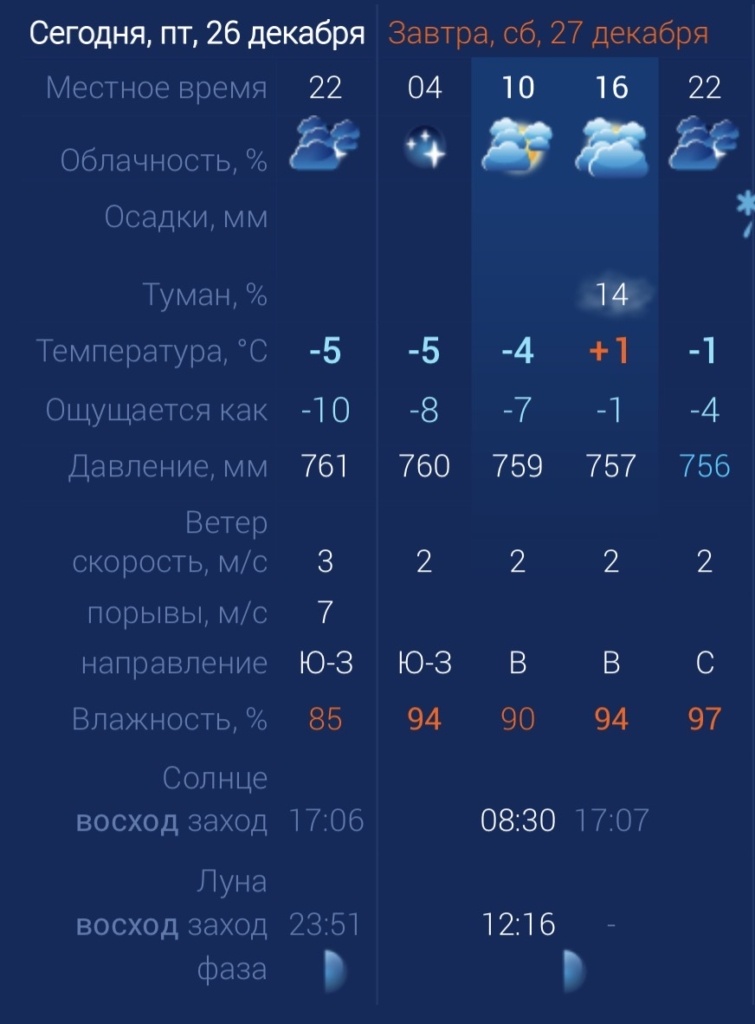В субботу в регион придет потепление. Весь снег растает и превратится в грязь. Что пожелать астраханцам в такую погоду? Наверное, только терпения. Утром температура воздуха в городе составит ‑4 градуса. Днем температура поднимется до +1. К вечеру похолодает до ‑1 градуса. Астраханцев ждет восточный ветер со скоростью 2 м/с. Атмосферное давление составит 757 мм рт. ст. Влажность воздуха выше нормы. На территории всего региона будет восточный ветер со скоростью 2–4 м/с. Температура воздуха ночью опустится до ‑7 градусов, а днем повысится до +2. Погодные приметы: Сообщение 27 декабря в Астраханской области ожидается плюсовая температура воздуха появились сначала на Астрахань.Ру последние новости региона.