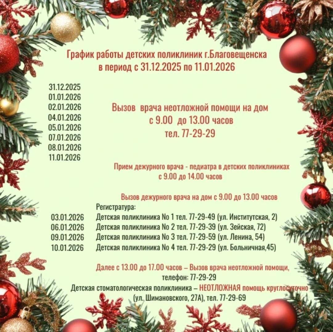 График работы детских поликлиник Благовещенска в праздничные выходные 📌