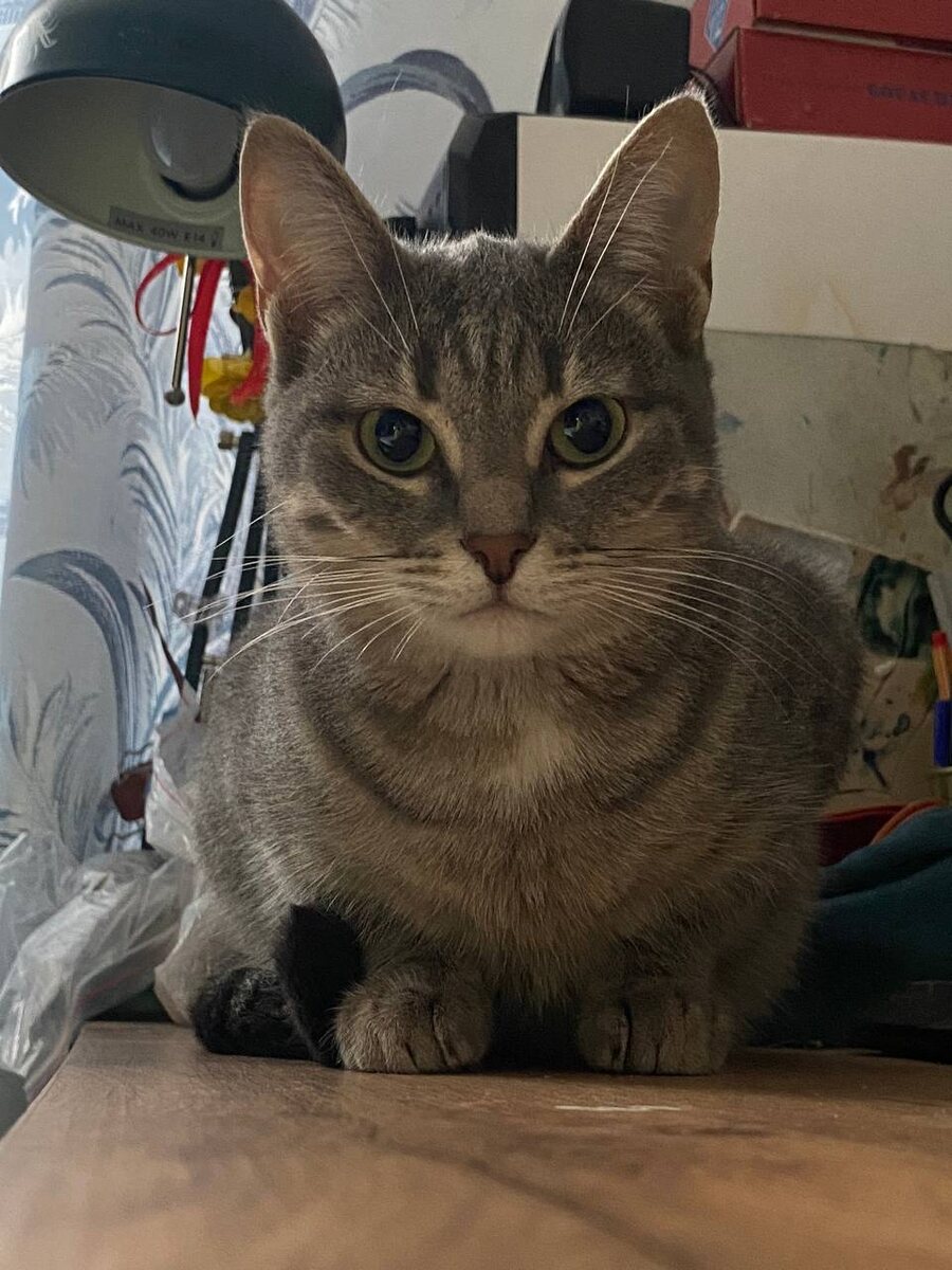 В районе Мамина-Сибиряка, 3, отзывается на кличку Ося. Светло-серая, полосатая.