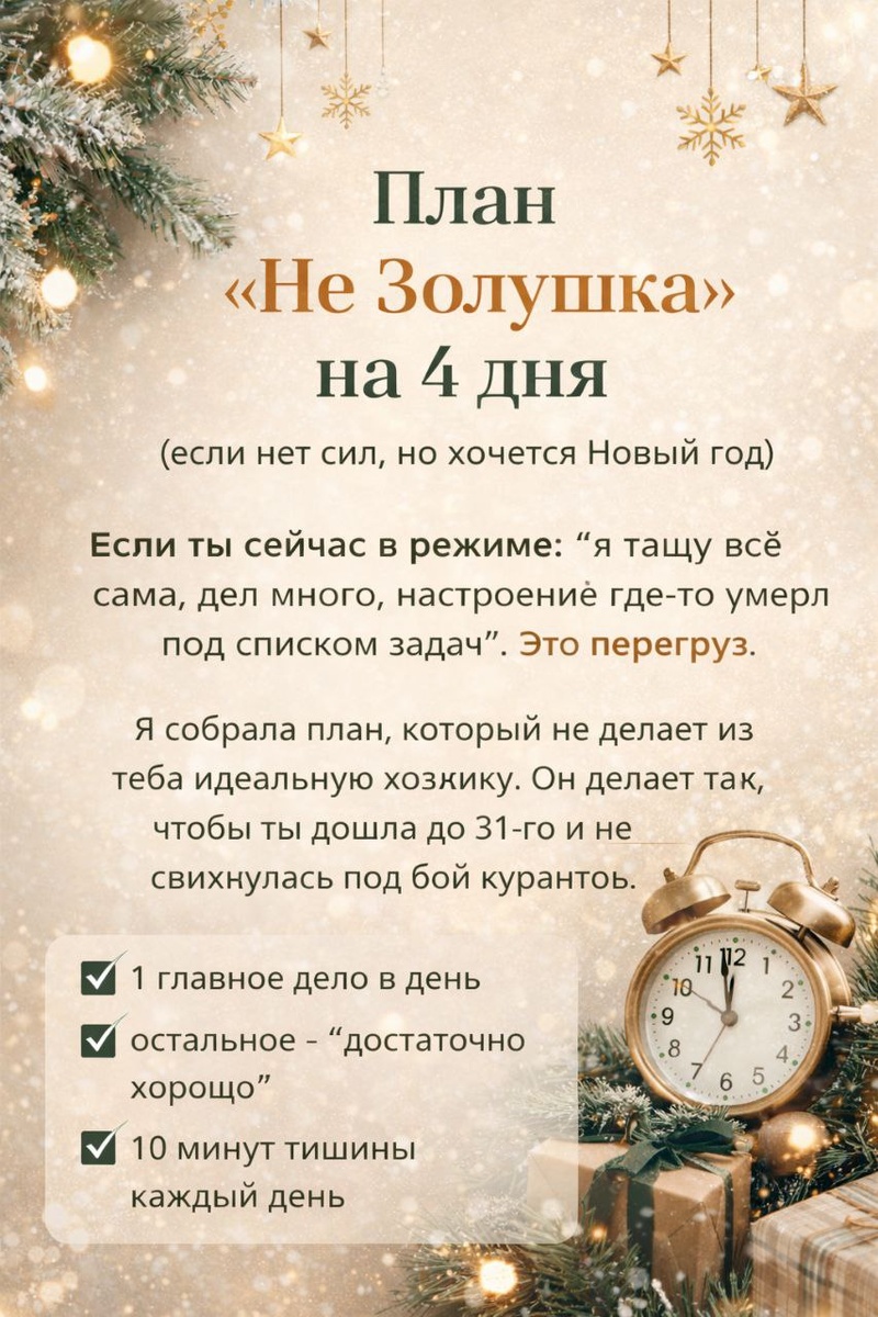 ) Если ты сейчас в режиме: "я тащу всё сама, дел много, настроение где-то умерло под списком задач". Это перегруз. Я собрала план, который не делает из тебя идеальную хозяйку. Он делает так, чтобы ты дошла до 31-го и не свихнулась под бой курантов. Правило на эти 4 дня: ✅ 1 главное дело в день ✅ остальное - "достаточно хорошо" ✅ 10 минут тишины каждый день (иначе психика просто выключит тебя) День 1️⃣ (сегодня/завтра): срезаем лишнее Выпиши 10 дел "надо к НГ". Теперь честно раздели на 3 колонки: 1) Обязательно (максимум 3 пункта) 2) Можно проще 3) Можно не делать И ответь на вопрос (прям одной строкой): Что я могу НЕ делать и Новый год всё равно будет? (1–3 пункта) День 2️⃣ (понедельник): меню без танцев с бубном Если нет сил - меню должно быть не "вау", а реально выполнимое. Мой любимый формат "чтобы вкусно и быстро": ✅ 1 горячее (10 минут подготовки) ✅ 1 салат “праздничный” ✅ нарезки + фрукты ✅ ещё один лёгкий салат ✅ десерт можно купить (да, это нормально) Горячее на 1
