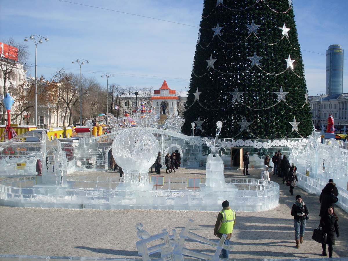 Каждый год в декабре на главной площади нашего города (площадь 1905 года) начинается подготовка к Новому году. Когда-то, во времена моего детства, там просто ставили огромную настоящую ёлку, делали большую ледяную горку и устанавливали несколько киосков. И мы с родителями обязательно 1-го или 2-го января посещали площадь. Я вспоминаю, что в одну из таких прогулок мне там купили книгу "Времена года". Прекрасная была книга, в ней были собраны рассказы и стихи разных писателей и поэтов, посвящённые временам года. Надо узнать, может быть эта книга ещё сохранилась у дочери в её библиотеке. В последние десятилетия там стали возводить большие ледовые городки. Каждый год они посвящались какой-то, актуальной на тот момент, тематике. А в последние несколько лет ледовый городок переместился на плотинку, а площадь полностью отвели под каток. А мне захотелось показать вам старый ледовый городок "Вишнёвый сад", который был там несколько лет назад. Видимо это была какая-то Чеховская годовщина. Уж