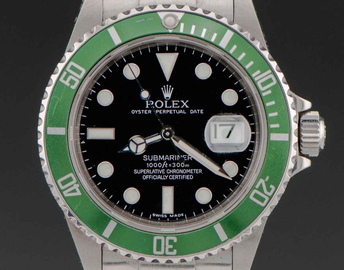 Rolex 16610LV, также известная как «Kermit», так же известный как «легушонок», была выпущена в 2003 году к 50-летию модели Submariner. Эта модель стала уникальной благодаря зелёному безелю и черному циферблату, что отличало её от классических версий Submariner с чёрным безелем. Выпуск данной модели был приурочен к значимому юбилею и символизировал инновации и традиции марки Rolex. Часы Rolex