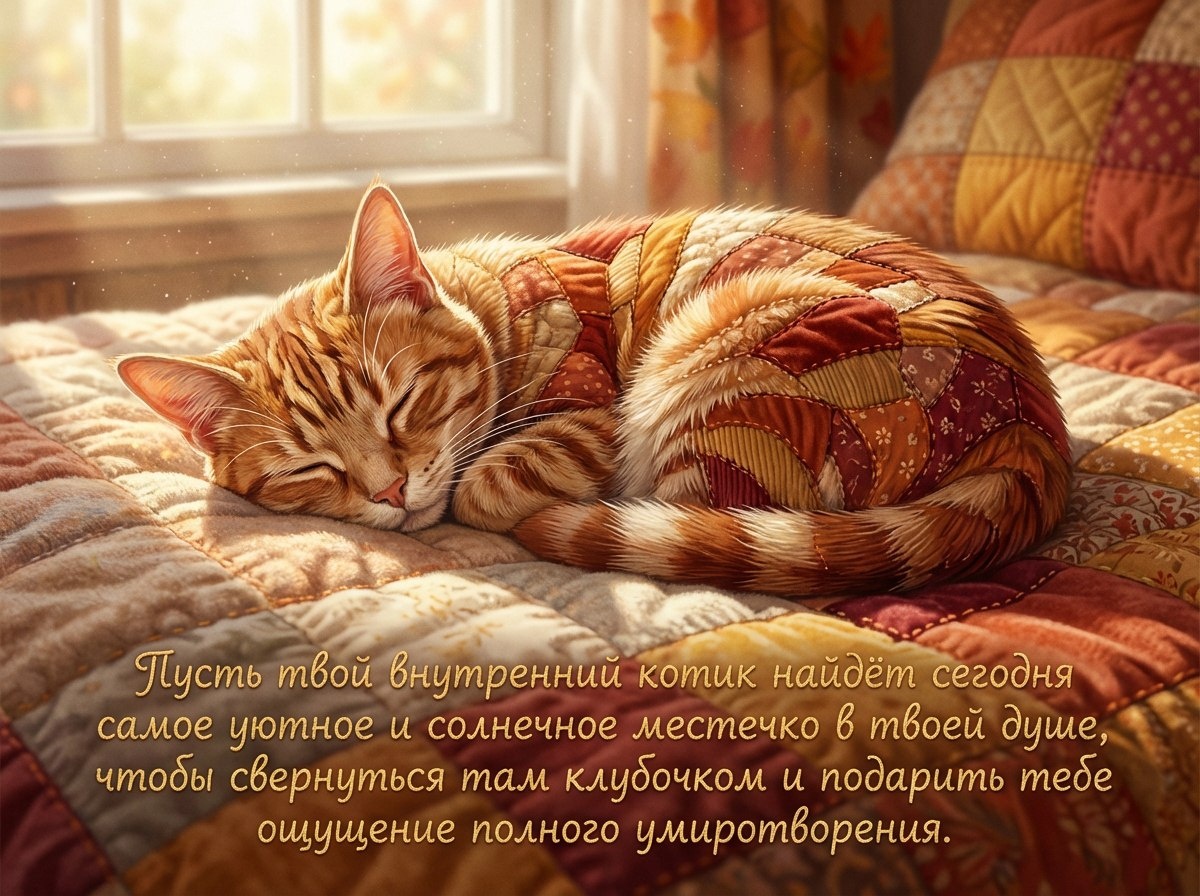 Просыпайся медленно, с наслаждением потягиваясь всем телом, словно маленький котёнок, которого только что разбудили первые лучи солнца. В этот Международный день кино пусть твой новый день станет твоим собственным, самым добрым фильмом, где ты — главный герой. Позволь своей истории разворачиваться без спешки, с любопытством и нежностью к каждому моменту. Прислушайся к своему внутреннему мурлыканью — этому тихому голосу душевного тепла, который всегда подскажет верный путь к гармонии. Пусть твой внутренний котик найдёт сегодня самое уютное и солнечное местечко в твоей душе, чтобы свернуться там клубочком и подарить тебе ощущение полного умиротворения. Желаю тебе дня, мягкого, как бархатные лапки, и наполненного тихим, золотистым светом.