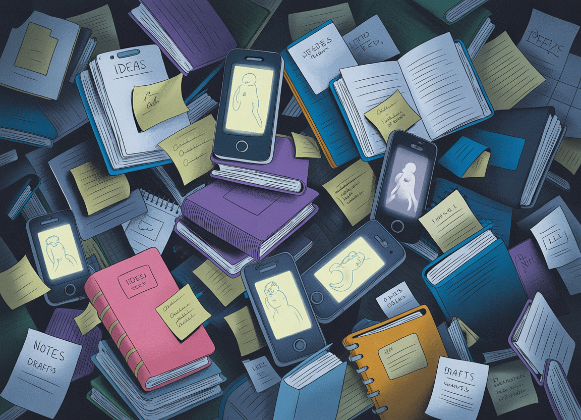 У вас на телефоне есть папка «Заметки». В ней — 47 записей. «Крутая идея для диалога в баре», «Имя для злодея — Маркус», «Что если герой найдет не письмо, а старый плеер?». На компьютере — документ «Разное.docx» с двумя абзацами про заброшенную станцию. В ящике стола — блокнот с наброском первой главы, который вы начали год назад.