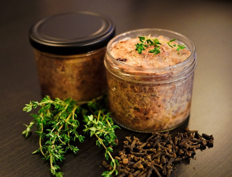 Паштет - это несколько видов мяса, измельчённых по-разному, специи и особое условие запекания. В состав нашего паштета входит: