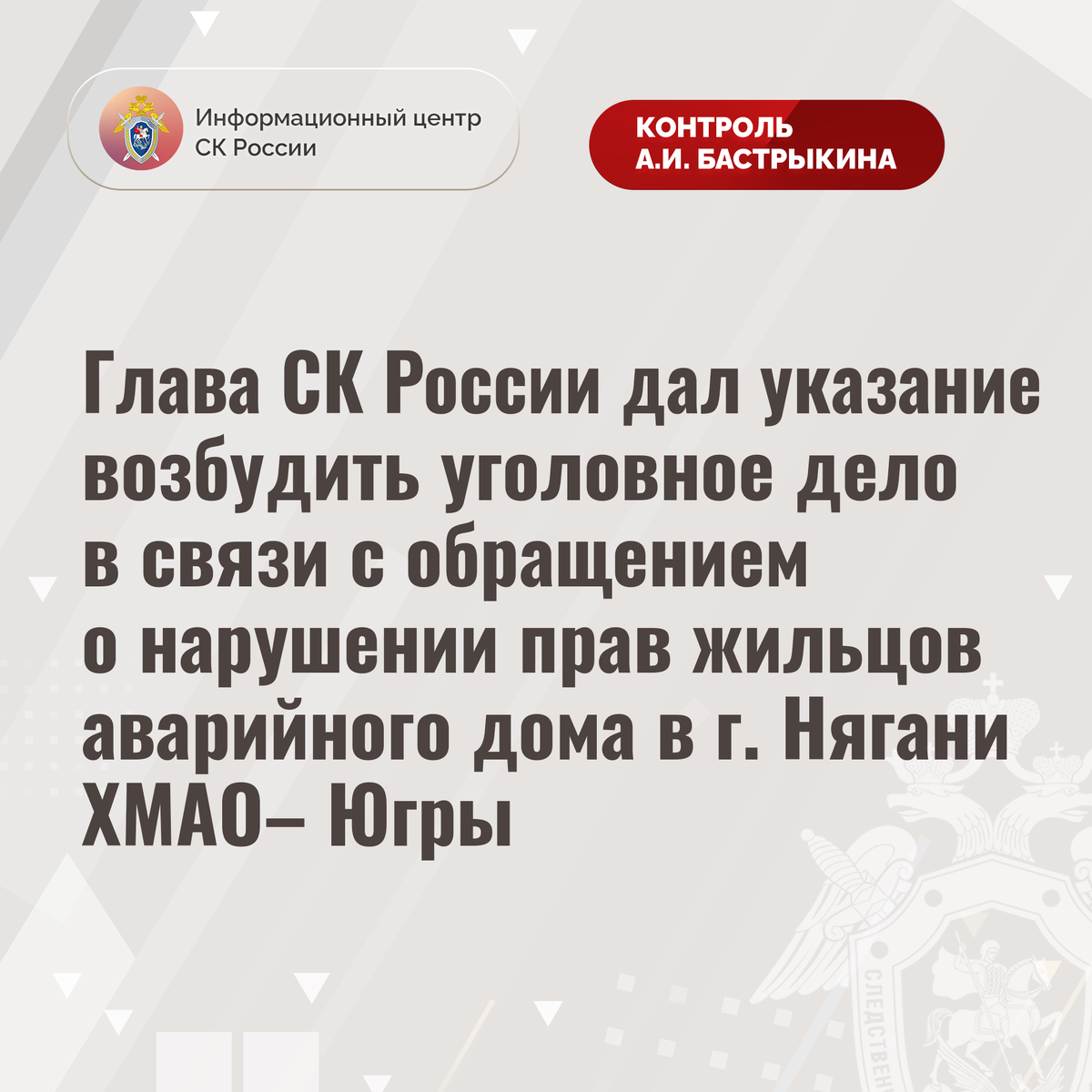 Глава СК России дал указание возбудить уголовное дело в связи с обращением о нарушении прав жильцов аварийного дома в г. Петрозаводске В Информационный центр СК России поступило обращение по вопросу длительного нерасселения жильцов многоквартирного дома на улице Геологов в городе Нягани Ханты-Мансийского автономного округа – Югры. Несущие конструкции здания 1978 года постройки разрушаются, температурный режим в жилых помещениях не соответствует установленным нормам. Несмотря на признание в 2020 году строения аварийным, до настоящего времени благоустроенное жилье собственникам не предоставлено, сроки расселения не сообщаются. Обращения граждан в различные инстанции результатов не принесли. В СУ СК России по Ханты-Мансийскому автономному округу – Югре организована процессуальная проверка. Председатель Следственного комитета Российской Федерации Александр Иванович Бастрыкин дал указание руководителю СУ СК России по Ханты-Мансийскому автономному округу – Югре Михаилу Викторовичу Мокшину в