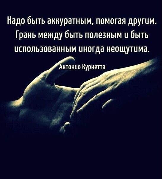 Слова Антонио Курнетты "Нужно быть осторожным, помогая другим. Иногда граница между тем, чтобы быть полезным, и тем, чтобы быть использованным, едва заметна" очень актуальны в нашем мире, где доброта и желание помочь могут обернуться неожиданными последствиями. Давайте разберёмся, что именно он хотел сказать и как это может быть применимо в нашей жизни. 1. Значение помощи Помощь другим — это благородное стремление, которое может приносить радость и удовлетворение. Многие из нас стремятся поддерживать близких и друзей, быть опорой в трудные времена. Как говорит известный психолог и автор книг по саморазвитию Брене Браун: "Сострадание — это не просто чувство, это действие". Однако, несмотря на положительные намерения, важно помнить, что помощь может иметь свои границы. 2. Опасность быть использованным Курнетта подчеркивает, что иногда бывает сложно провести грань между тем, чтобы быть полезным, и тем, чтобы стать жертвой манипуляций. В нашем желании помочь мы можем оказаться в ситуации