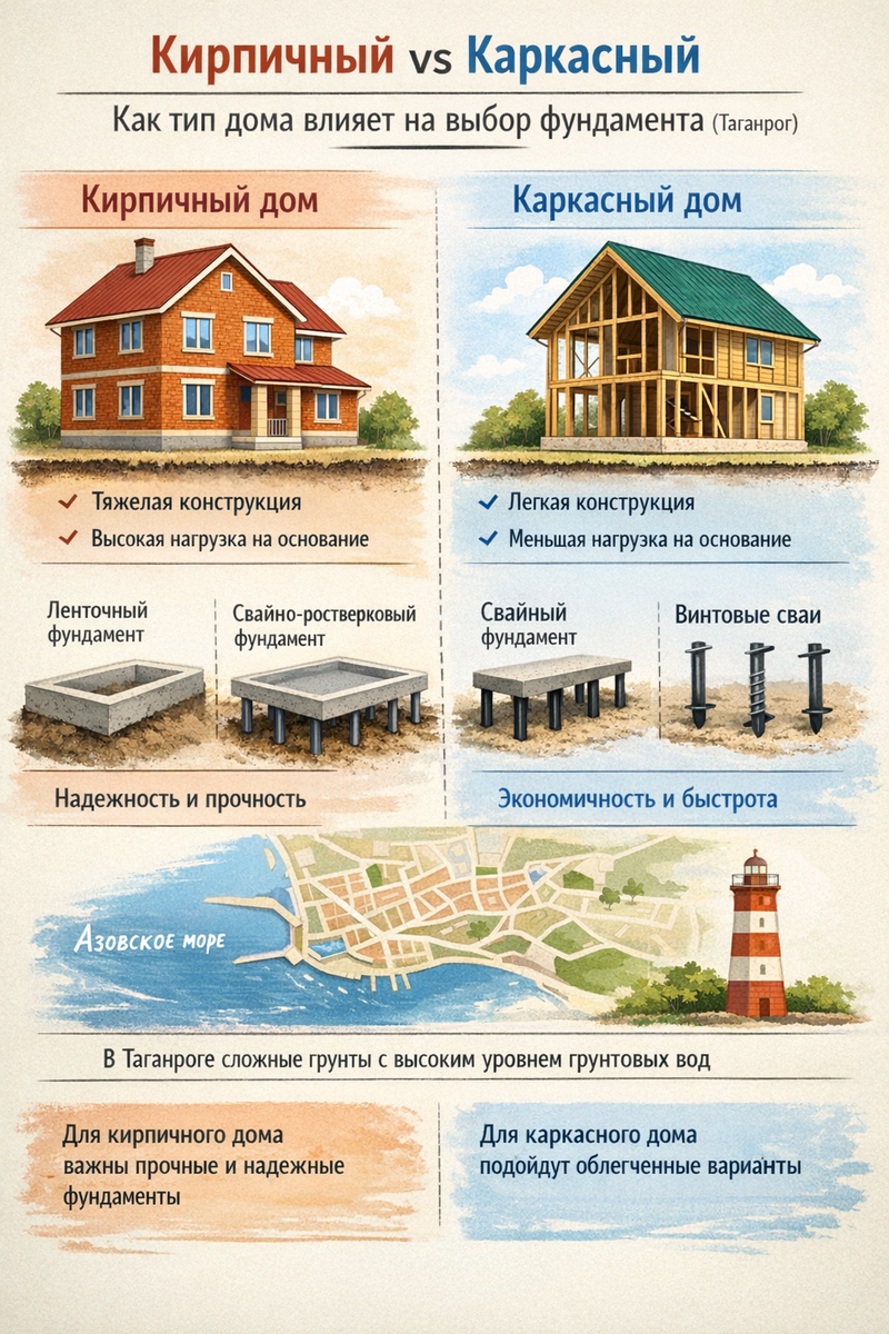 🏠 Кирпичный vs каркасный: как тип дома влияет на выбор фундамента (Таганрог)
