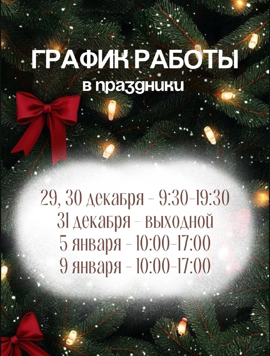 : 29 декабря 9:30-19:30 30 декабря 9:30-19:30 31 декабря - выходной 5 января 10:00-17:00 9 января 10:00-17:00 С 12 января работаем в обычном графике Доставка работает по режиму работы магазина В ближайшие дни расскажем о новых мероприятиях в январе ❄️