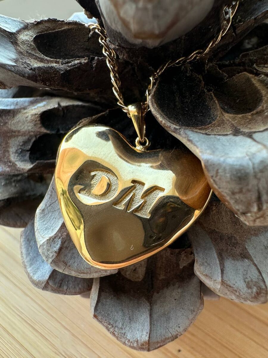 Вес кулона составляет 13 грамм, что делает его приятным и ощутимым аксессуаром, который станет ярким дополнением к вашему образу. На гладкой поверхности кулона выгравированы инициалы "DM", придающие украшению индивидуальность и особое значение для его обладательницы. Это украшение идеально подходит для подарка, выражая глубину чувств и искренность намерений дарителя.