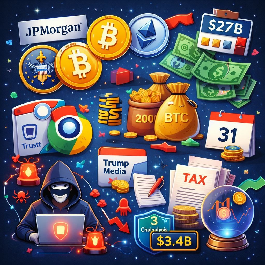 🏦 JPMorgan может запустить криптотрейдинг для институционалов По данным Bloomberg/Reuters, JPMorgan рассматривает запуск торговли криптоактивами для институциональных клиентов. Почему важно: крупнейшие банки США перестают быть «наблюдателями» и заходят в рынок напрямую — это долгосрочный плюс для ликвидности BTC и ETH. 📉 ETF фиксируют оттоки в праздничную неделю Спотовые Bitcoin и Ethereum ETF показали чистые оттоки на фоне тонкой ликвидности и низкой активности перед праздниками. Эффект: давление на цену в краткосроке и усиление волатильности из-за чувствительности к потокам. 🔓 Взлом Trust Wallet: потери более $6 млн Из-за компрометации Chrome-расширения пользователи потеряли минимум $6–7 млн; команда объявила о компенсациях. Урок: браузерные кошельки остаются одной из самых уязвимых точек в self-custody. 🏢 Корпоративные BTC-казначейства в фокусе Trump Media переместила около 2 000 BTC (~$174 млн), усилив внимание к ончейн-движениям крупных публичных держателей. Тренд: корпорат
