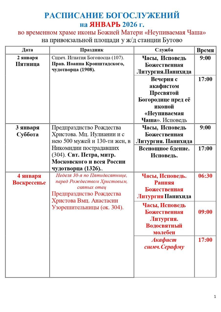 Расписание Богослужений на январь 2026 г.