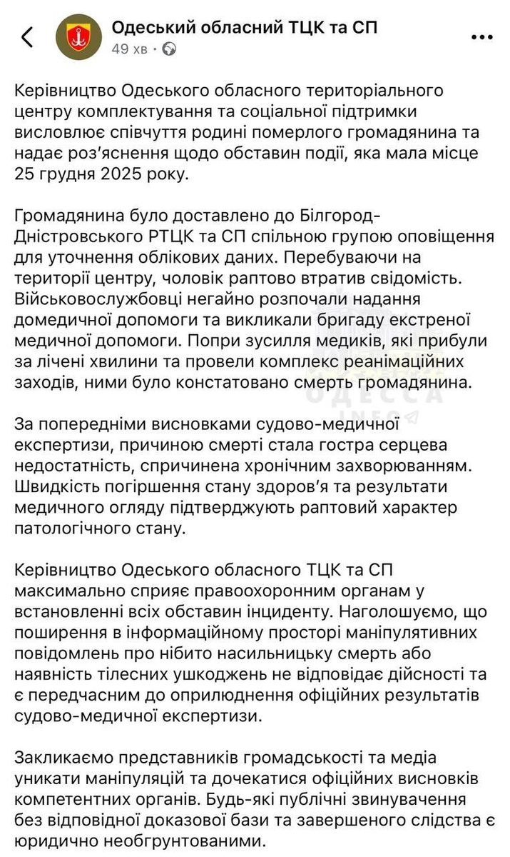 Паблики пишут, что 25 декабря около 11 часов дня его избили сотрудники ТЦК, после чего он потерял сознание, был доставлен в ТЦК и умер на месте. Также сообщается, что позже с телефона погибшего его сыну позвонили с просьбой приехать на опознание тела, а в заключении о смерти указали "сердечная недостаточность". В публикациях говорится, что началось расследование и к делу подключились адвокаты. Одесский областной ТЦК и СП эту версию отрицает. В официальном заявлении сказано, что мужчину доставили в ТЦК для уточнения учетных данных, где он "внезапно потерял сознание". Ему оказывали домедицинскую помощь и вызвали скорую, однако спасти его не удалось. По предварительным данным судебно-медицинской экспертизы, причиной смерти стала острая сердечная недостаточность на фоне хронического заболевания. В ТЦК заявляют, что признаков насильственной смерти не выявлено, и призывают дождаться официальных выводов следствия. Подписаться ✉️Обратная связь 🔼 Boost нашего канала🔼 📱Вконтакте 📱Однокл