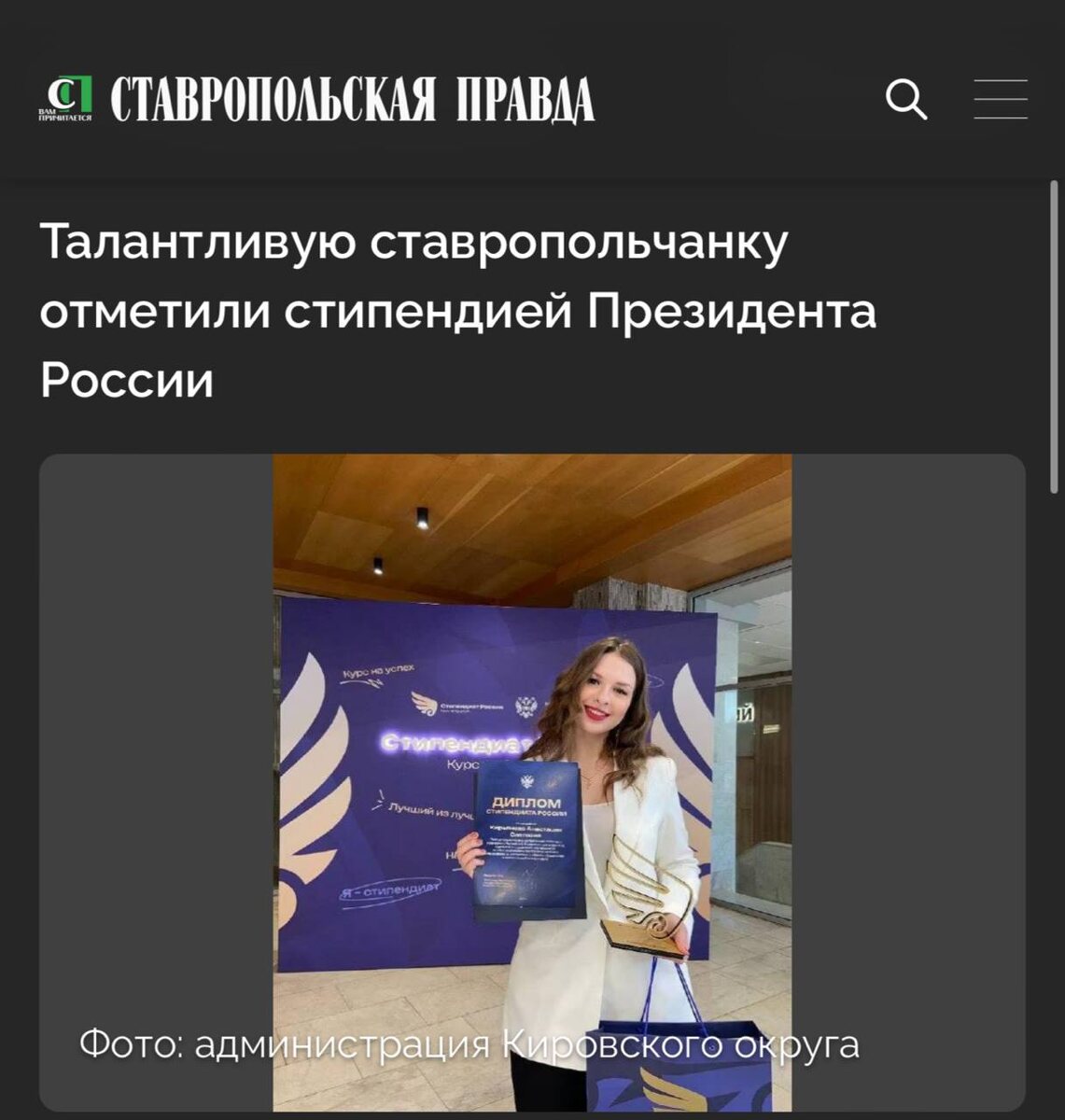 Жительница Новопавловска Анастасия Кирьянова стала победительницей конкурса на получение стипендии Президента России. Эта награда предназначена для студентов, курсантов и слушателей, обучающихся по программам высшего образования. Анастасия выиграла в номинации «Здравоохранение и медицинские науки». Анастасия Кирьянова учится на шестом курсе Первого Московского государственного медицинского университета имени И.М. Сеченова. Её профессиональная цель — стать фетальным хирургом, то есть специалистом, который выполняет хирургические операции на плоде внутри утробы матери. По информации администрации Кировского округа, Анастасия выделяется своими высокими академическими успехами, инициативностью и стремлением к развитию. Она активно участвует в научных исследованиях, пишет научные статьи и выступает на всероссийских и международных форумах. Ранее губернатор Владимир Владимиров сообщал, что на Ставрополье расширили меры поддержки для участников СВО и их семей.