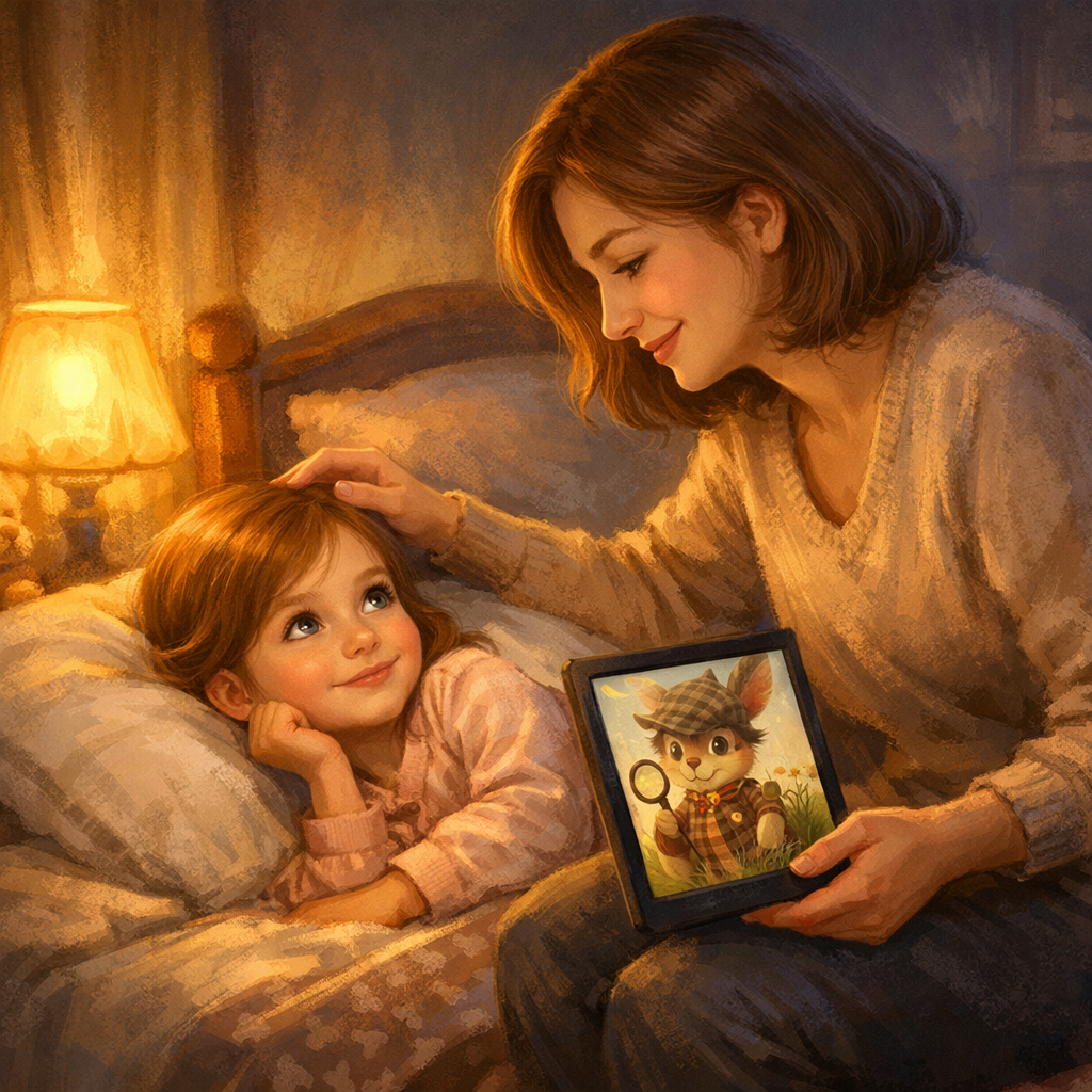 Даша молча кивает, и я вижу, как в её голове эти новые понятия находят свои полочки, складываясь в картину мира. Она готова слушать дальше, и я снова возвращаюсь к тексту, к зайчику-детективу и тайне исчезнувшего волшебника, чувствуя, как между нами в тишине комнаты растёт незримая, тёплая нить понимания и доверия.