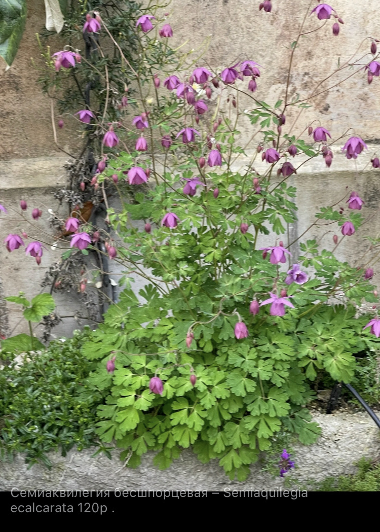 Семиаквилегия бесшпорцевая. Родственница обычных аквилегий, но не высокая, примерно 30 см. Цветки тоже намного мельче, общий вид цветущего растения лёгкий и воздушный. Семена всходят с небольшой стратификацией, но мне не охота возиться с посевами дома, я все горшки в снег до весны отправляю.