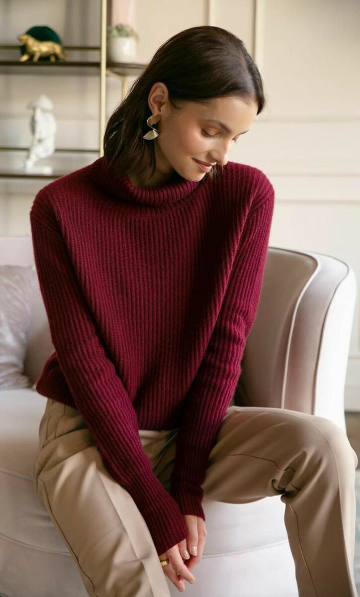 Первый и главный секрет этого свитера - его уникальный диалог с вашим лицом. Мы часто ищем «улучшающие» цвета, но бордовый работает тоньше. Он не осветляет - он углубляет.