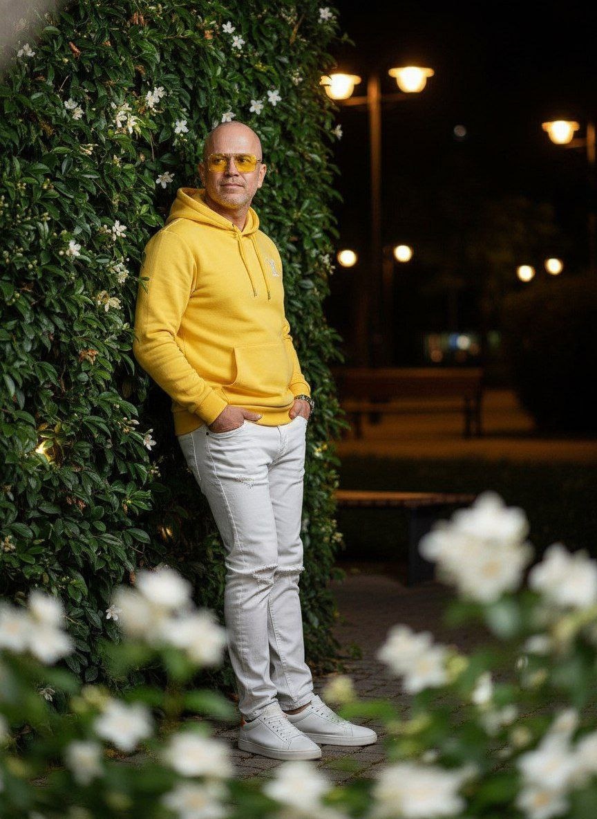 месте на открытом воздухе. Сохрани неизменными черты лица, естественное выражение, прическу и пропорции тела. На нем желтая куртка поверх черной рубашки, белые рваные брюки и белые модные кроссовки, желтые квадратные солнцезащитные очки. Его руки естественно лежат на ногах в расслабленной позе. На заднем плане — светящиеся уличные фонари. Легкая улыбка. Передний план и глубина резкости: небольшие нежные цветки жасмина на переднем плане намеренно размыты, создавая мягкое боке и естественное кадрирование. Средний план — резкий фокус на лице. Фон мягко размыт зеленью для четкого выделения объекта ➡️ Тут БОТЫ 👉канал в Дзен 💰Donate