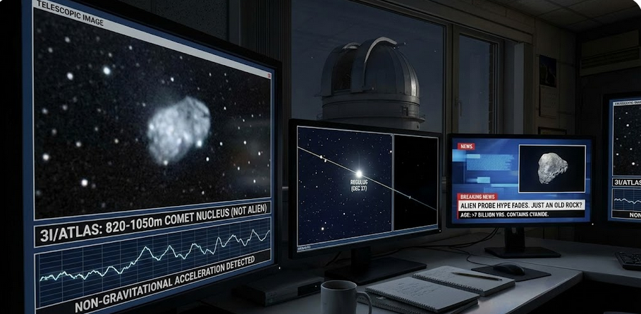 Помнишь ажиотаж вокруг кометы 3I/ATLAS? Весь 2025 год мы следили за этим «кораблём пришельцев», ждали встречи 19 декабря. Но что-то пошло не так. Совсем не так. Сначала — разочарование. Учёные обещали гигантское ядро размером с небольшой город. А оказалось — всего лишь кусок льда диаметром 820-1050 метров. Это как разница между стадионом и трёхкомнатной квартирой. Почему так ошиблись? Да потому что смотрели издалека, через 4,5 миллиарда километров. Попробуй угадать размер машины на расстоянии от Москвы до Луны. Потом — тишина. Радиотелескопы слушали 3I/ATLAS, как подслушивающий аппарат в соседней квартире. Ни сигнала. Ни намёка на искусство. Только мёртвая тишина космоса. Гипотеза о «зонде инопланетян» рухнула быстрее, чем курсы криптовалют в 2022-м. Но самое странное — поведение. Комета вела себя как кипящий чайник с крышкой. Скорость росла неравномерно, то отставая, то ускоряясь. Это как если бы ты толкал санки с горы, а они то тормозили сами, то катились быстрее твоего разбега.