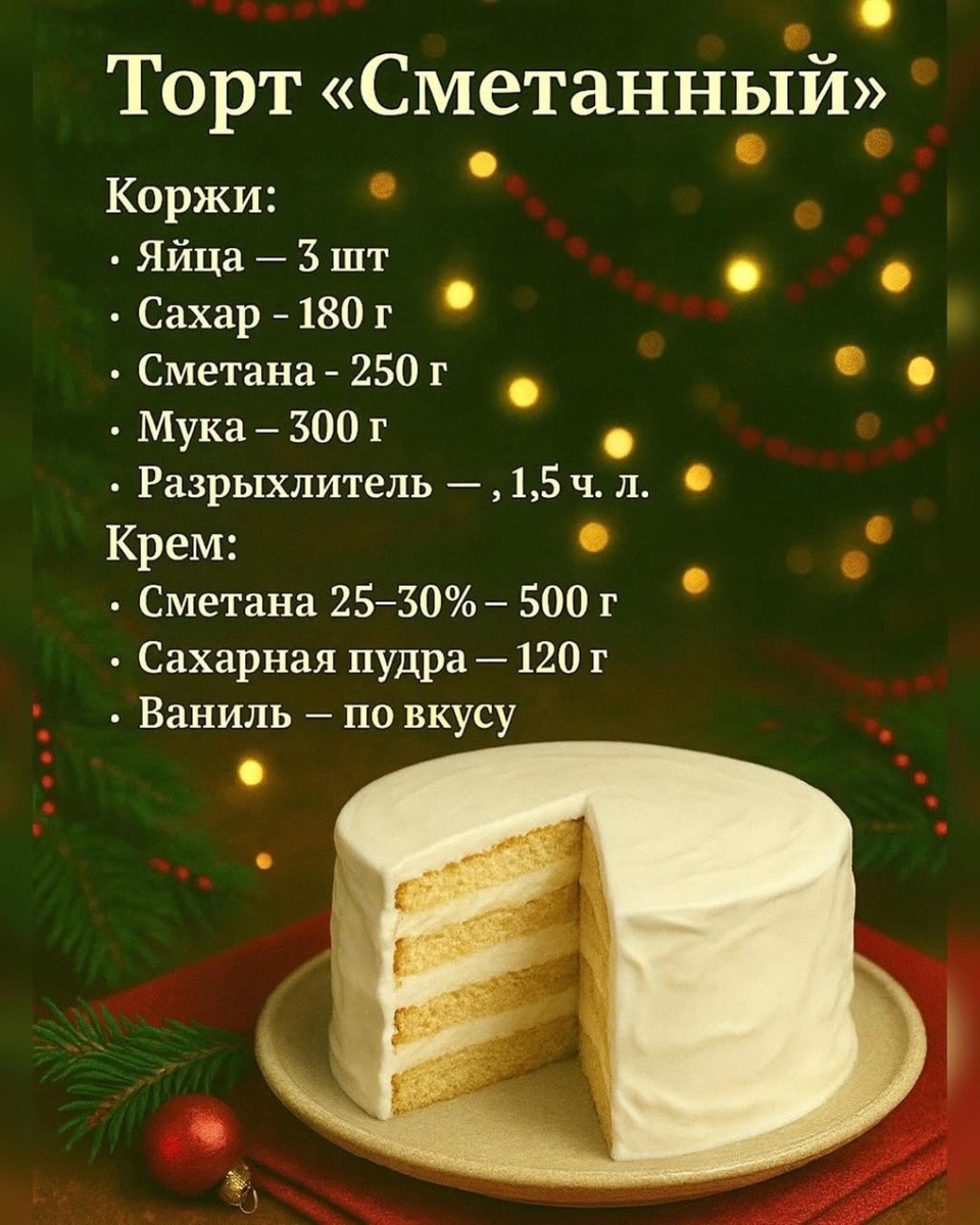 » Очень мягкий и нежный Приготовление 1. Взбейте яйца с сахаром до пышности. 2. Добавьте сметану, перемешайте. 3. Введите муку и разрыхлитель. 4. Разделите тесто на 2–3 части и выпекайте коржи при 180°C 20–25 минут. 5. Смешайте сметану с пудрой. 6. Промажьте коржи, дайте торту пропитаться 3–4 часа, лучше ночь.