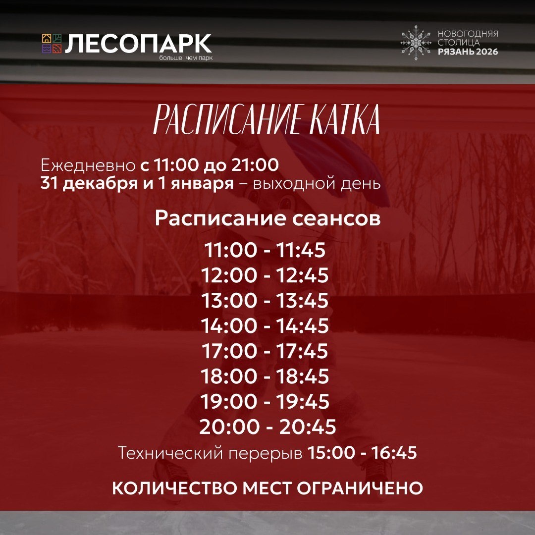 Открывается каток! Третий в городе, да ещё и бесплатный ⛸ Уже завтра, 29 декабря, в тестовом режиме запускают ледовую площадку в Лесопарке. В тестовом, чтобы оценить условия для полноценного запуска! Каток разместят на территории Центра уличного спорта «Под мостом», работать он будет по расписанию (прикрепляем его) с 11:00 до 21:00 ежедневно. С 15:00 до 16:45 — технический перерыв. 31 декабря и 1 января — выходные дни. Важно: проката коньков не предусмотрено, переобуться можно будет на трибуне, дети должны кататься в сопровождении взрослых. Сохраняйте и пересылайте пост тем, кого хотите пригласить на каток ❄️ #гуляка_нововогодний 🤩 Рязанский гуляка 🇷🇺 Рязанский гуляка