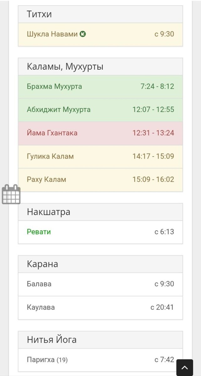 ✨✨✨✨✨ Восход: ☀️ Jh - Sw -08:59 🌛 Sw - 11:49 Закат: ☀️Jh - Sw - 16:01 🌛Sw - 23:31 Воскресенье - Рави Вара/День Солнца ☀️ ✨✨✨✨✨ Шукла Пакша/Растущий цикл Луны🌛 ✨✨✨✨✨ Титхи/Лунные сутки и Карана/половина лунных суток: ✨ Аштами/8 на рассвете, затем Навами/9 в 9:30 Караны: Бава на рассвете, Балава в 9:30 и Каулава с 20:41 Лунные сутки агрессивные, а Караны хорошие, смотрите ссылки с описанием, благоприятной и не благоприятной деятельности ☝️ выделены синим ✨✨✨✨✨ Йога/Связь Солнца и Луны Паригха - железный брус или засов- Неблагоприятная ✨✨✨✨✨✨✨ Накшатра/Лунное Созвездие Накшатра Ревати - изобилие Управитель - Будха/Меркурий Значение - щедрое процветание Символ - барабан Божество - Пушан - бог - защитник Основные звёзды - ζ Рыб ✨Ревати вдохновляет человека на достижение истинного процветания и благополучия через щедрость, сострадание, преданность и доброту. Она благословляет романтические отношения, делает нас сторонниками ненасильственных мер, помогает найти путь к утраченному. Она та
