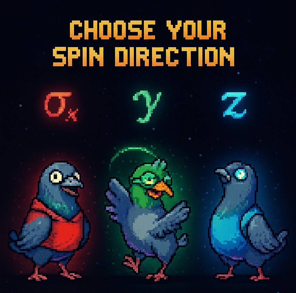 Крылья машут голубем или голубь машет крыльями. 🔬 Научная часть — просто, но это не точно В микромире частицы не просто двигаются — у них есть внутреннее вращение, или спин. Спин — не «вихрь» и не вращение в обычном смысле. Это квантовое свойство, как внутренний компас: частица ведёт себя так, будто внутри у неё маленькая стрелка, которая может быть направлена вверх, вниз или в любую суперпозицию между ними. Чтобы описывать этот спин, физики придумали три матрицы Паули, которые не написать в посте в телеге. Но вы их и не запомните, поэтому главное, что они — как три волшебных зеркала, через которые спиновое состояние частицы отражается по-разному: по оси x, y или z. Любое измерение спина — это выбор, через какое зеркало смотреть. Поверни одно — и два других перестанут быть чёткими. Обычно спин - это целое число 1 или -1 А спин ½ — это когда «стрелка» не просто вверх или вниз, а может существовать в обеих ориентациях одновременно, пока не измеришь. 🕊️ Голуби, помогите!!! Безумный гол