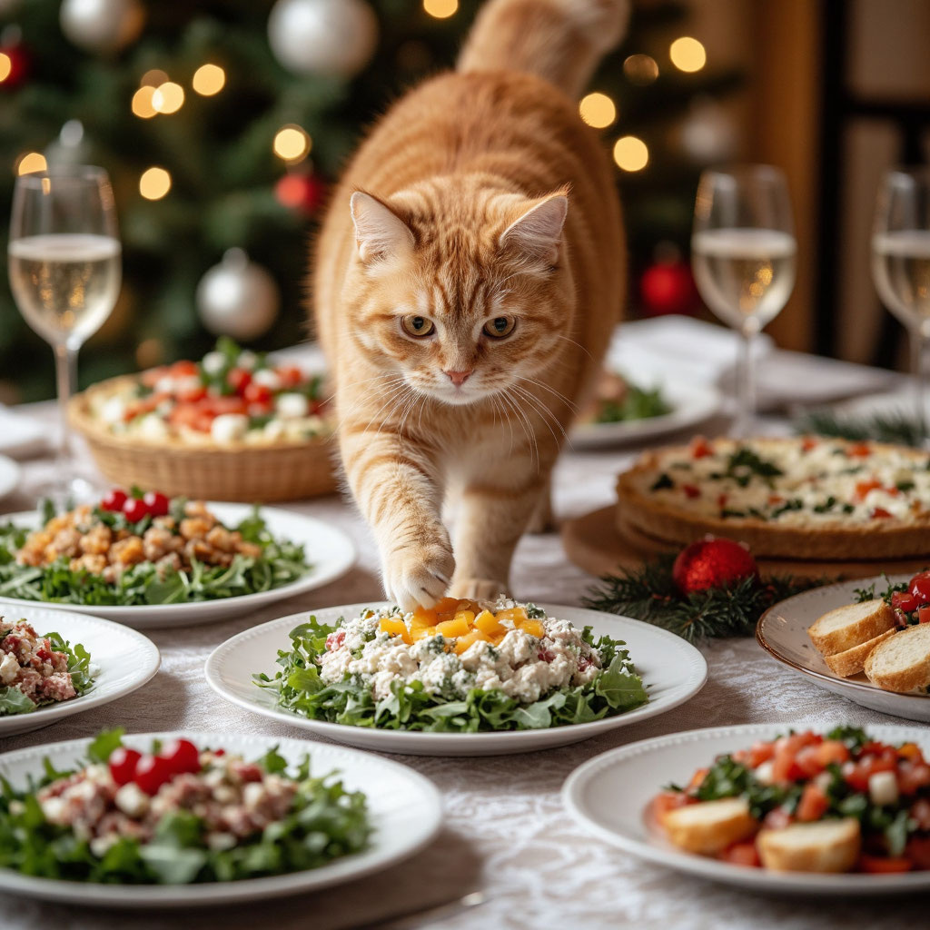 Привет, друзья-кошатники и главные повара новогоднего застолья! С вами снова я, человек, который 31 декабря держит оборону на кухне против четырёх пар самых жадных и проникновенных глаз в мире. Тонкс делает вид, что ей всё равно, но нос так и тянется к тарелкам. Хитрая Рыська изучает траекторию падения кусочков с научной точностью. Хулиган Мотя готов к решительному прыжку на стол. А Рикардо считает, что любая еда — это продолжение игры «поймай и съешь». И сегодня — наш кулинарный детектив. Тема: почему наш праздничный стол для кошки — это минное поле, замаскированное под вкусняшки? Разберём по косточкам (вернее, по ингредиентам) главных новогодних «убийц» желудка. Гладиаторские бои в салатнице: разбираем классику 1. Оливье — он же «Салат-Невидимка» Казалось бы, картошечка, морковка, огурец... Что может быть безобиднее? Но в этом салате опасность таится в маскировке. · Лук и майонез — двойной удар. Лук (репчатый, зелёный, порей) содержит вещества, разрушающие эритроциты у кошек и привод