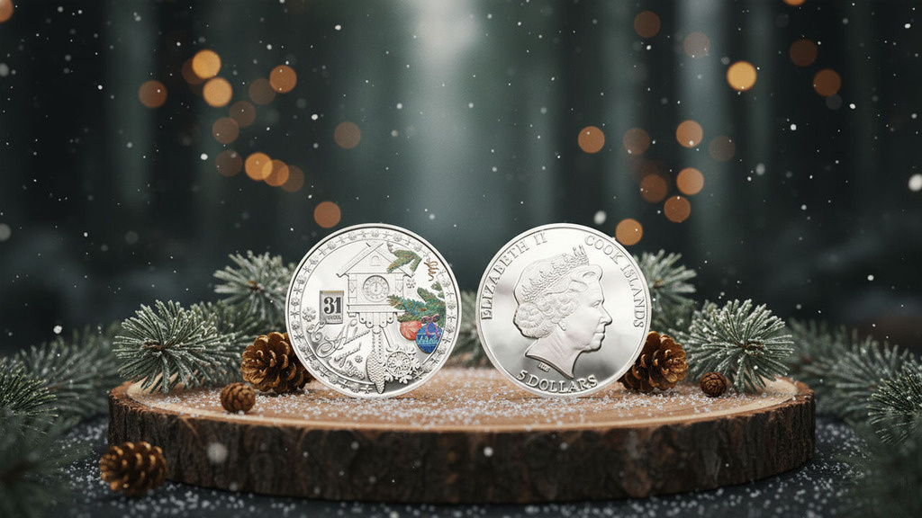🎄 Серебряная монета «С Новым годом — Часы с кукушкой» — Острова Кука