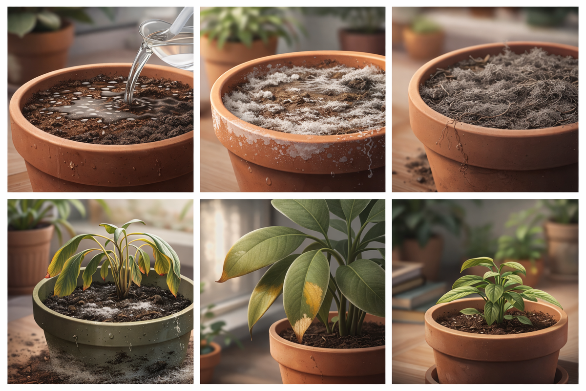 Мы часто смотрим на листья, стебли, цветение, но забываем, что основная жизнь растения происходит внизу — в горшке. Со временем почва перестаёт выполнять свои функции так же эффективно, как раньше — её называют “уставшей”. Это не всегда про «плохой грунт». Чаще — про естественный процесс: почва работает, удерживает влагу, отдаёт питание, взаимодействует с корнями и постепенно теряет структуру и баланс. Важно вовремя заметить, что почве нужна помощь. Вот пять главных признаков. Один из самых частых симптомов “усталости” — грунт перестаёт «дышать». — вода долго стоит на поверхности;