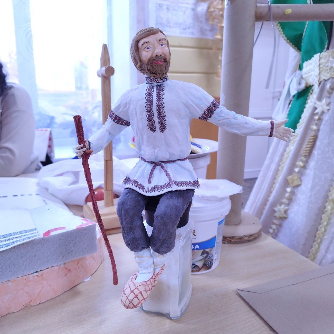 Покрасила бабуле юбку и деду рубаху украсила на спине и посох для деда соорудила, старенький ведь он уже.