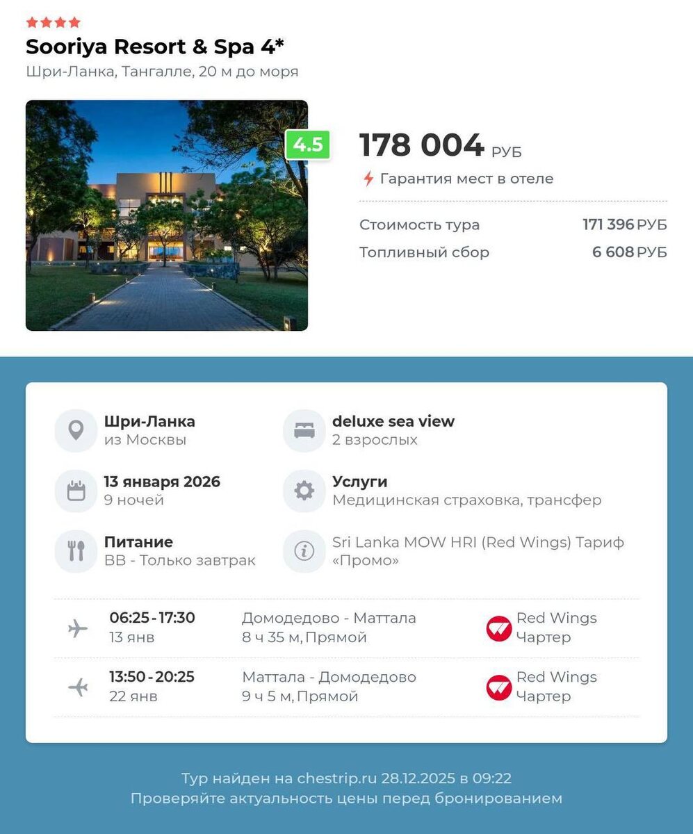 😍 🏠 SOORIYA RESORT & SPA 4⭐️ ✈️ Москва ➡️ Шри-Ланка, Тангалле 📅 13 янв, 🌙 9нч 🛌 deluxe sea view, 2взр 🍽 Завтрак 🏷️ 178 004 руб 🏠 CITRUS WASKADUWA 5⭐️ ✈️ Москва ➡️ Шри-Ланка, Калутара 📅 13 янв, 🌙 9нч 🛌 superior room, 2взр 🍽 Завтрак 🏷️ 208 092 руб 🏠 TURYAA KALUTARA 4⭐️ ✈️ Москва ➡️ Шри-Ланка, Калутара 📅 13 янв, 🌙 9нч 🛌 south wing classic room, 2взр 🍽 Завтрак 🏷️ 211 484 руб 🏠 THE BLUE WATER 5⭐️ ✈️ Москва ➡️ Шри-Ланка, Калутара 📅 13 янв, 🌙 9нч 🛌 deluxe room, 2взр 🍽 Завтрак 🏷️ 222 985 руб 🏠 NH BENTOTA CEYSANDS RESORT (EX. CENTARA CEYSANDS) 4⭐️ ✈️ Москва ➡️ Шри-Ланка, Бентота 📅 13 янв, 🌙 9нч 🛌 deluxe room river view, 2взр 🍽 Завтрак 🏷️ 234 403 руб 🏠 SHERATON KOSGODA TURTLE BEACH RESORT 5⭐️ ✈️ Москва ➡️ Шри-Ланка, Бентота 📅 13 янв, 🌙 9нч 🛌 deluxe garden view, 2взр 🍽 Завтрак 🏷️ 247 972 руб 🏠 ARALIYA BEACH RESORT & SPA 5⭐️ ✈️ Москва ➡️ Шри-Ланка, Унаватуна 📅 13 янв, 🌙 9нч 🛌 deluxe, 2взр 🍽 Завтрак 🏷️ 274 067 руб 🏠 RIU SRI LANKA AHUNGALLA 5⭐️ ✈️