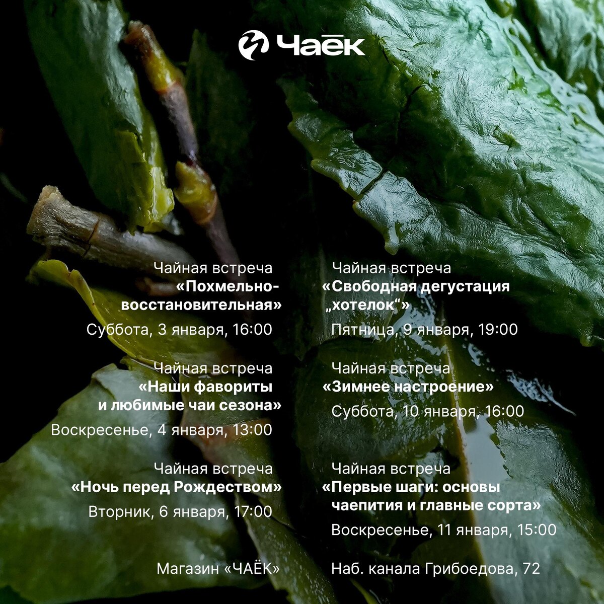 1. «Похмельно-восстановительная» Первая чайная встреча в 2026 году! После праздников нужно восстановить силы, поэтому начнём с мягкого детокса, чтобы прийти в себя, и закончим бодрящим чаем для энергичности. Приходите обогащаться полезными микроэлементами, помогающими восстановлению организма! 📅 Суббота, 3 января, 16:00 👤 Саша 💵 1 000 ₽ 2. «Наши фавориты и любимые чаи сезона» На дегустации вы попробуете одни из лучших сортов, которые относятся к разряду нетривиальных и экспериментальных. С любовью созданные и с любовью заваренные. Приходите погружаться в чаи из списка фаворитов Даши! 📅 Воскресенье, 4 января, 13:00 👤 Даша 💵 1 000 ₽ 3. «Ночь перед Рождеством» В канун Рождества приоткроем завесу над тайнами года! Будем пить вкусные зимние чаи и проведём ритуалы гадания на воске и чаинках, как в старину. Каждый гость получит в подарок метафорическую карту — личный символ на весь год! 📅 Вторник, 6 января, 17:00 👤 Саша 💵 1 100 ₽ 4. «Свободная дегустация „хотелок“» Приглашаем на д
