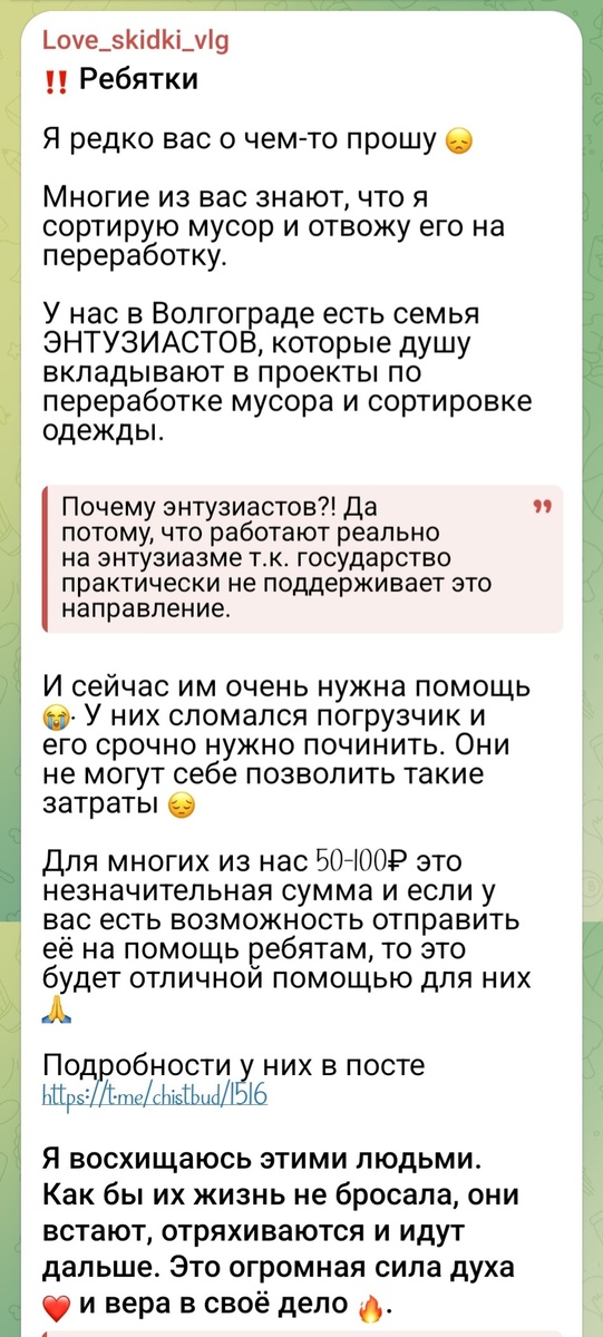 ! ✨ Друзья, мы хотим от всего сердца поблагодарить каждого из вас, кто откликнулся на нашу просьбу и сделал репост публикации о сборе средств на ремонт нашего погрузчика! 🙏 Мы видим вашу активность, и это невероятно ценно! Каждый ваш репост – это не просто клик, это огромный вклад в распространение информации. Благодаря вам о нашей ситуации узнаёт гораздо больше людей, и это дает нам надежду, что наш незаменимый помощник скоро вернётся в строй. Ваша поддержка, в любой её форме, невероятно важна для нас! Как вы знаете, наш погрузчик – это настоящая рабочая лошадка, без которой многие процессы просто останавливаются. Его поломка серьезно тормозит нашу деятельность, и мы очень хотим как можно скорее вернуть его к работе. 🛠️ А чтобы это произошло, нам нужна ваша финансовая помощь! 🛠️ Даже самая небольшая сумма приближает нас к заветной цели – отремонтировать погрузчик и снова работать в полную силу. Если у вас есть возможность и желание помочь, пожалуйста, переходите по ссылке к