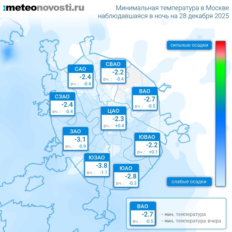 Минимальная температура ночью в Москве была на 4.7°C выше нормы, что немного теплее, чем обычно. Самая низкая температура -3.8°C была зафиксирована в 3 часа на юго-западе города, а теплее всего было в центре: -1.1°C. Разница по минимальной температуре в разных частях столицы составила за минувшую ночь 2.7°C. Максимальные порывы ветра ночью достигали 5 м/с. Атмосферное давление за ночь не изменилось и составило 730 мм.рт.ст. Повсеместно прошли небольшие осадки. Больше всего осадков выпало на юго-западе города – 1.3 мм. Самая холодная ночь в Москве 28 декабря наблюдалась в 1892 году, когда минимальная температура составила -38.8°C, а самая теплая в 1997 году с температурой +1.5°C. Перейти на сайт Прогноз погоды на 14 дней