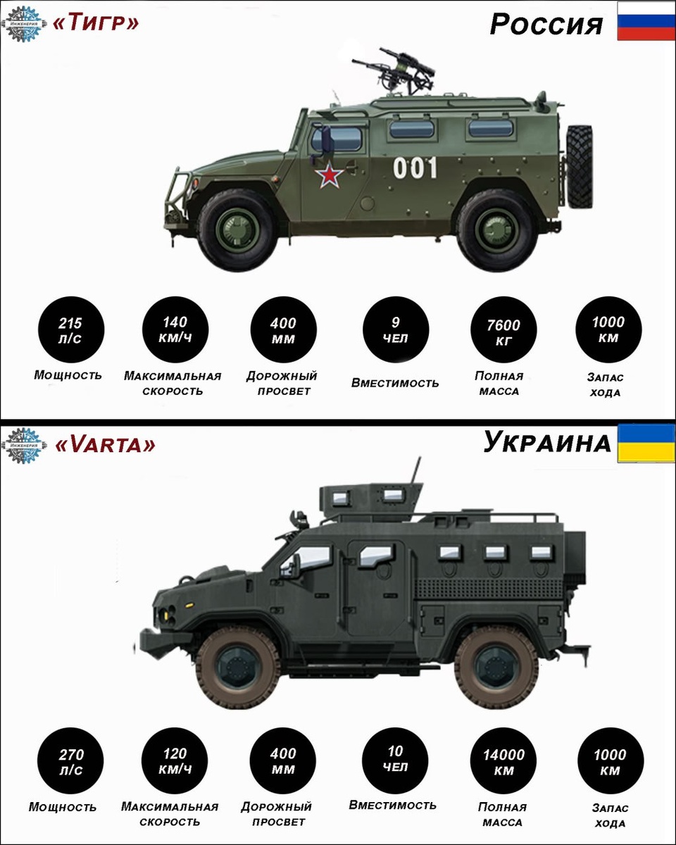 🇷🇺 "Тигр" vs 🇺🇦 "Varta" Представляем вашему вниманию сравнительную инфографику российского и украинского бронеавтомобилей ⚠️ Несмотря на то, что «Варта» превосходит «Тигр» в классе бронезащиты (имеет противоминную защиту класса MRAP, «Тигр» имеет следующие преимущества: 🔵габариты: «Тигр» обладает низким силуэтом, тем самым является менее заметной целью на поле боя 🔵скорость: «Тигр» развивает скорость до 120–125 км/ч, в то время как тяжелая «Варта» редко разгоняется выше 90 км/ч 🔵уникальное шасси: «Тигр» имеет оригинальное шасси с независимой торсионной подвеской всех колес, что обеспечивает плавность хода на высоких скоростях по пересеченной местности 🔵удельная мощность: «Тигр» легче «Варты» более чем в два раза. Благодаря этому он меньше проваливается в мягкие грунты и болотистую местность 🔵из-за высокого центра тяжести и раскачки грузового шасси «Варта» менее стабильна при ведении высокоточного огня в движении 🔵надежность узлов: подвеска «Тигра» рассчитана на экстремаль