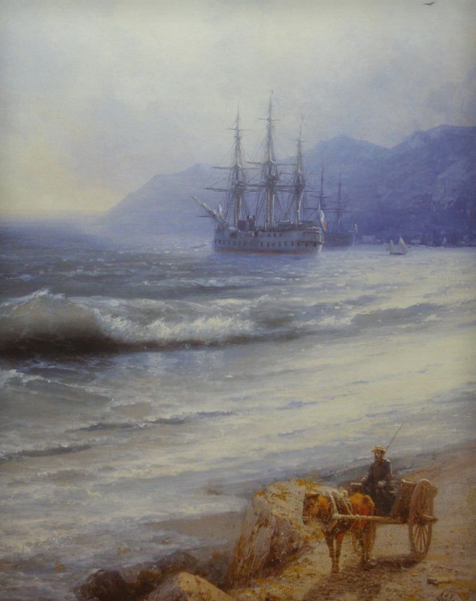 , (1817–1900). "Прилив", 1870 Холст, масло. Из фондов: Серпуховский историко-художественный музей, Серпухов. Картина «Прилив» И. К. Айвазовского, написанная по памяти после утренней прогулки по берегу моря, отличается свободной ясностью композиции и органичной трактовкой подвижных фактур. Созданная за несколько часов до заката, она отражает переход к более сдержанной, но богатой живописными приёмами манере художника. Для этого периода характерна виртуозная оттеночная гамма синего цвета. На картине изображён момент, когда море надвигается на зрителя, рассекаясь на гребни и капли у горизонта. Параллельные силуэты парусника и двуколки подчёркивают тему пограничья между морской зыбью и земной твердью. В глубине пейзажа горизонт разделяет воду и розоватые облака. Двуколка символизирует неторопливость быта Феодосии, а французский корабль — связь с большим миром. Вероятно, это побережье Коктебеля с Верблюжьей горой. #живопись #искусство #графика #Айвазовский #Феодосия #Коктебель