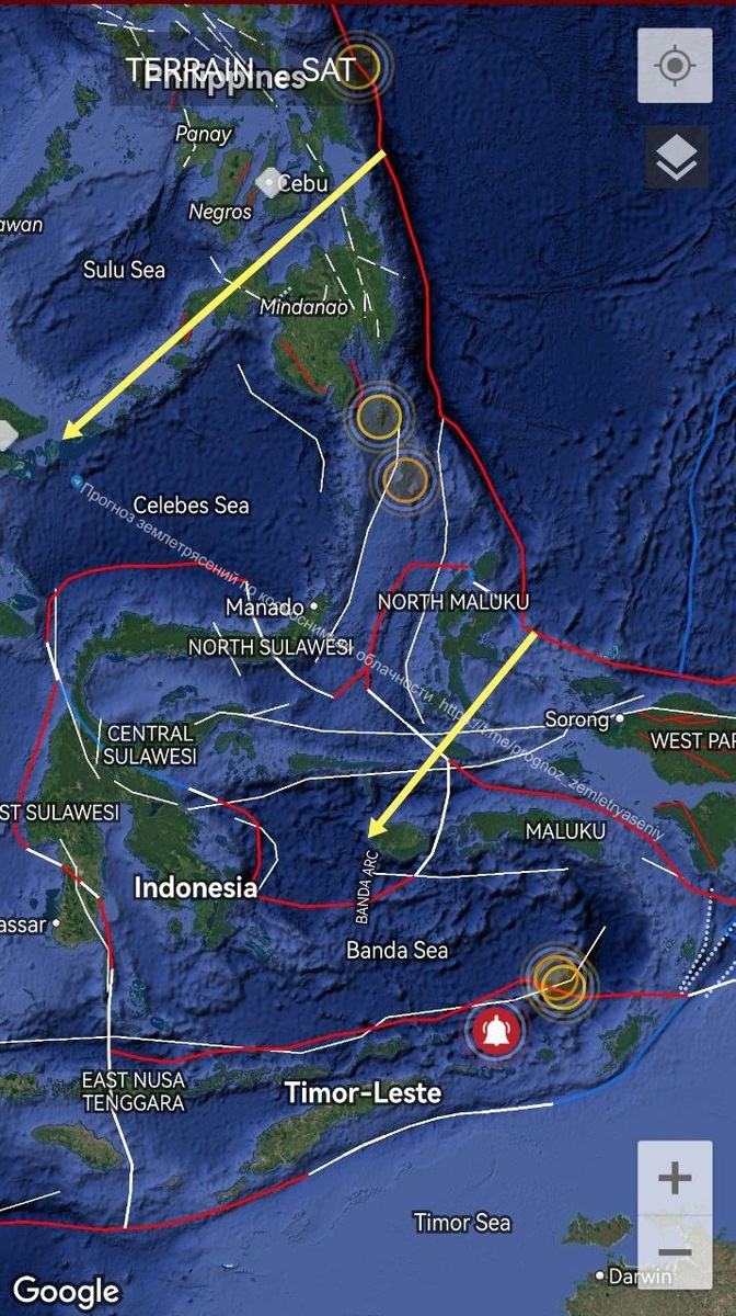 Ночью здесь наблюдалась углообразная облачная структура. Как-то раз на моей памяти подобное уже закончилось сильным землетрясением в данной зоне. ====== Northern Indonesia on the border with the Philippines is in question... An angular cloud structure of the M7 level was observed here at night. Once in my memory, something like this has already ended with a strong earthquake in this area.