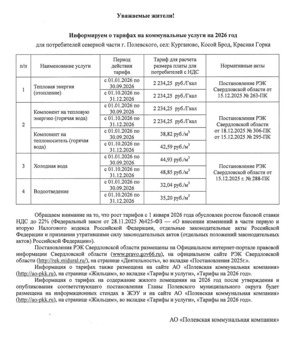 ПКК информирует о тарифах на коммунальные услуги на 2026 год